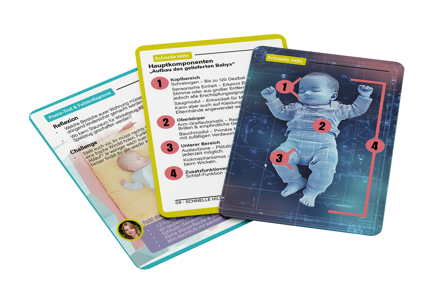 Ob Vorbereitung, erste Wochen oder kleine Notfälle – die Karten bieten Orientierung mit einem Augenzwinkern.